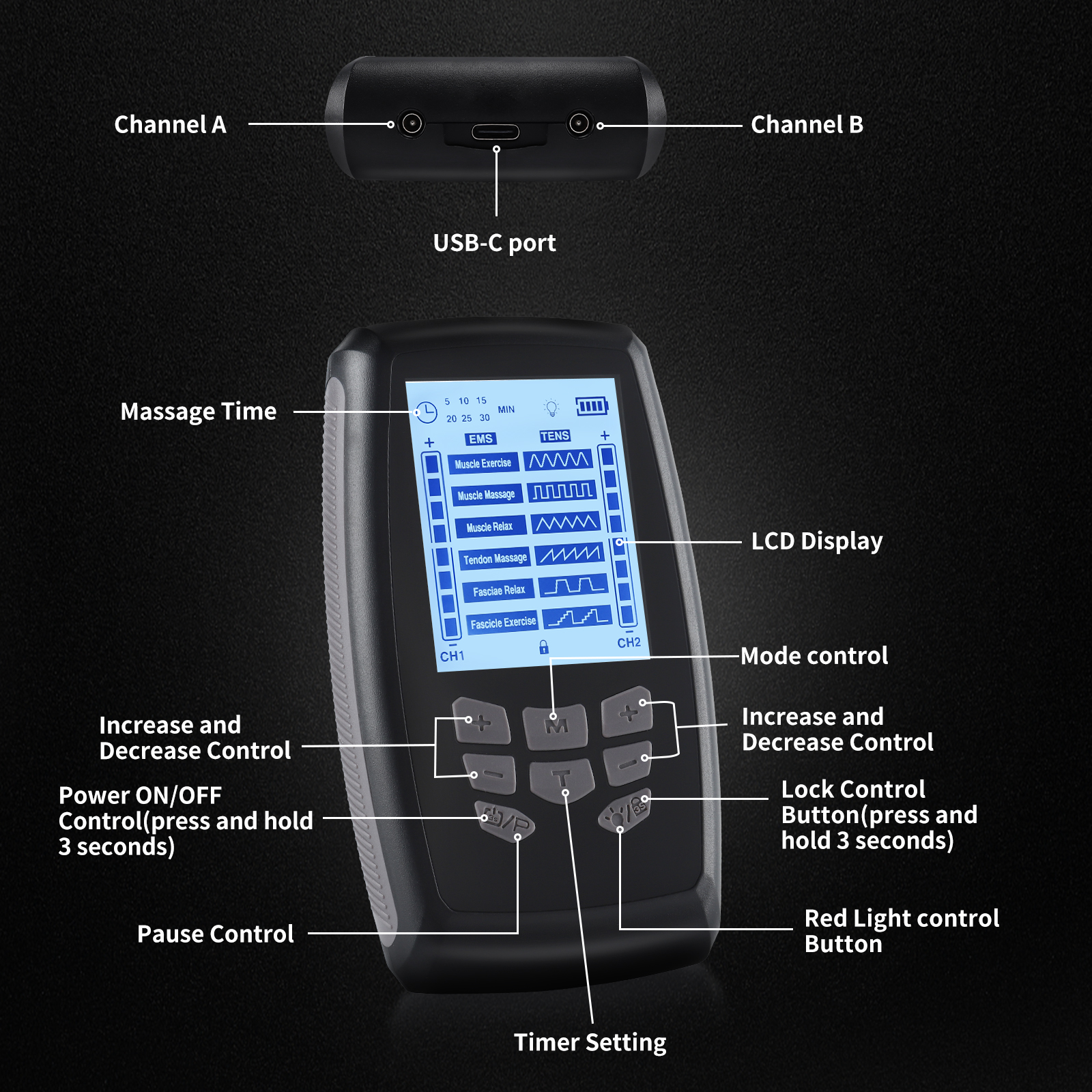 *Working modes: there are 12 modes, including 6 EMS muscle exercise modes, 6 TENS pain massage treatment modes (6 combination modes, 6 simple modes)